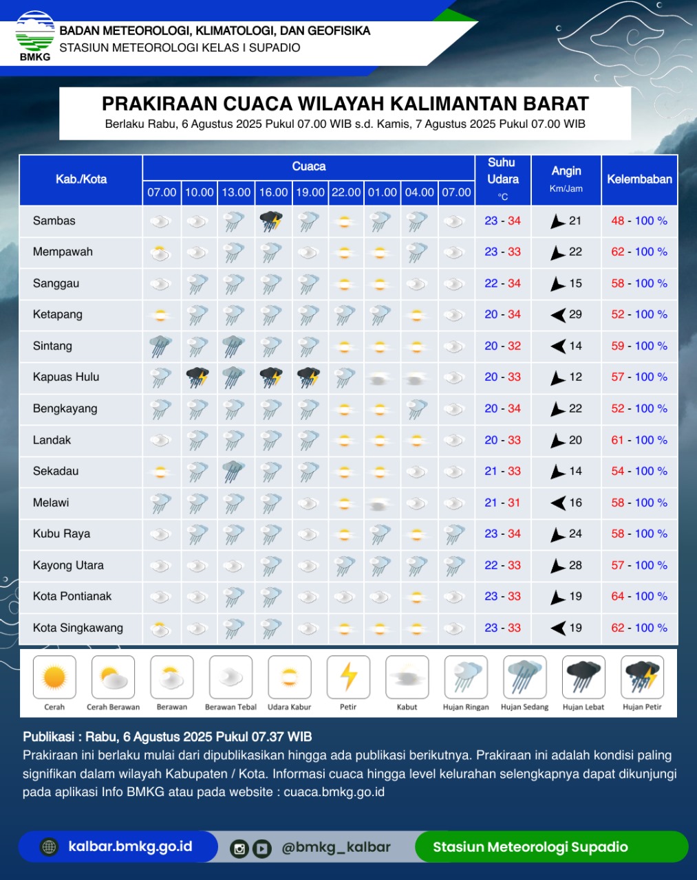 Dalam rilis prakiraan cuaca yang berlaku mulai Rabu, 6 Agustus 2025 pukul 07.00 WIB hingga Kamis, 7 Agustus 2025 pukul 07.00 WIB, BMKG mencatat adanya potensi hujan dengan intensitas sedang hingga lebat, bahkan disertai petir dan angin kencang di beberapa kabupaten dan kota.